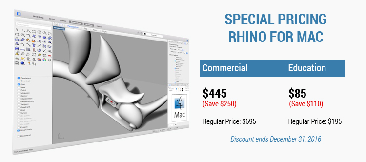 Rhino for Mac was launched this year with special pricing. However, this deal is ending at the end of this year. Don’t miss your last chance to get this great deal in December!